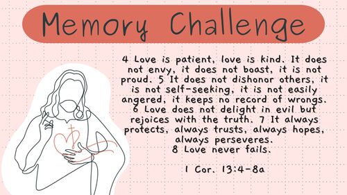 Recite 2 Corinthians 1:4 for a small prize, and 1 Corinthians 13:4-8 for a $5 Braum's gift card at Shartel Kidz Club on February 23! Click on the video for a word-for-word song rendition of the Challenge Verse.