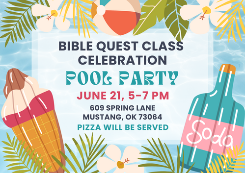 Bible Quest Families are invited to a pool party with the Aldridge's! Please RSVP below so we know how much food to buy.